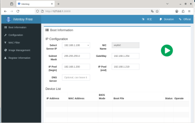 Une fois sur cette page, il faut démarrer effectivement le serveur PXE en cliquant sur la fléche blanche sur rond vert.